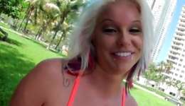 Sexy blonde is working out outdoors and showing off her giant yeah tits