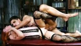 Hot beauty red haired tramp look is extremely sensuous in her provoking lingerie is trapped in a cage and then starts having vulgar sex with her horny mister fucking